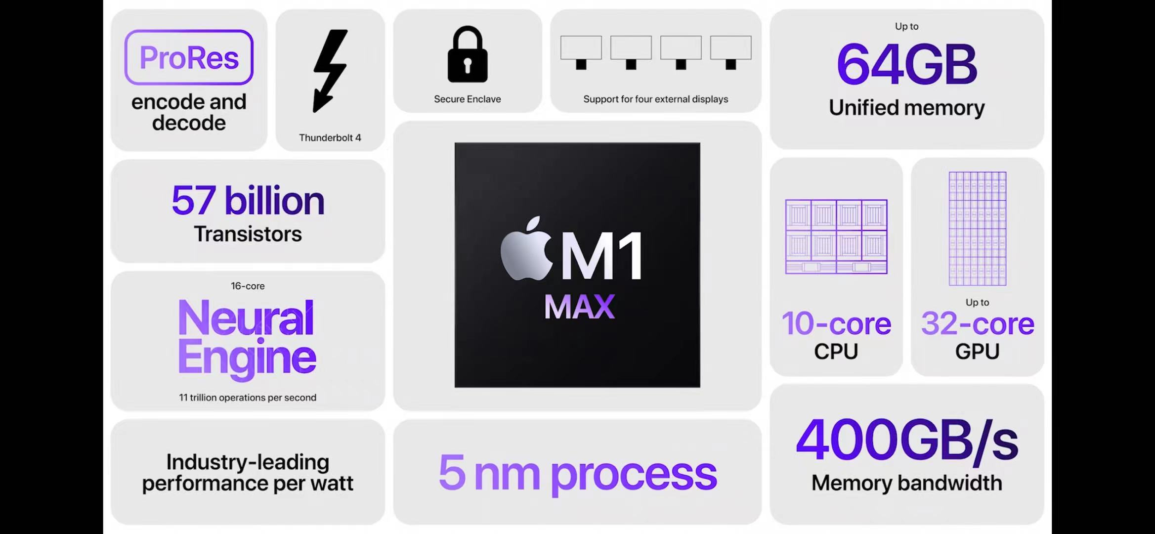 本次提升的两款芯片主要用于接下来介绍的MacBook Pro(2021)总结下来两款芯片主要在Soc总晶体管数(Pro达337亿,Max达570亿)、CPU(最高10核,并采用八个高性能核心配两个高能效核心的模式)、GPU(最高32核)、RAM(最高64G)、内部带宽(Pro达200GB/s,Max达400GB/s)以及Neural Engine(神经网络引擎16核)这些主要方面。