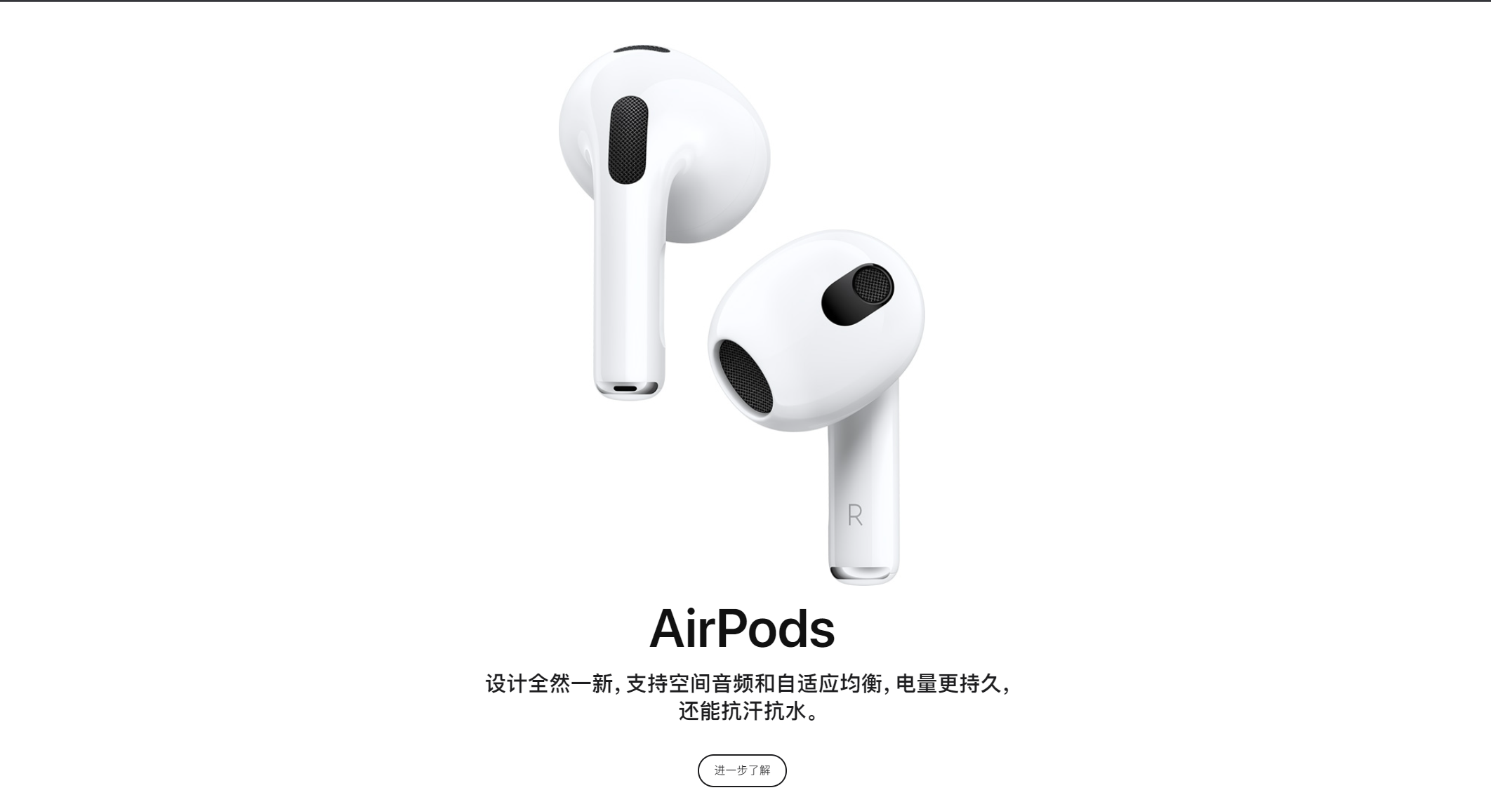 再者就是大家期待已久的AirPods更新——AirPods 3 (大概描述一下和之前的猜测差不多:AirPods Pro的简化版,去掉了橡胶耳塞,支持了空间音频和全景声,不支持主动降噪,提升了充电效率和电池续航,抗汗方面没有提升,仍为IPX4)售价为179$