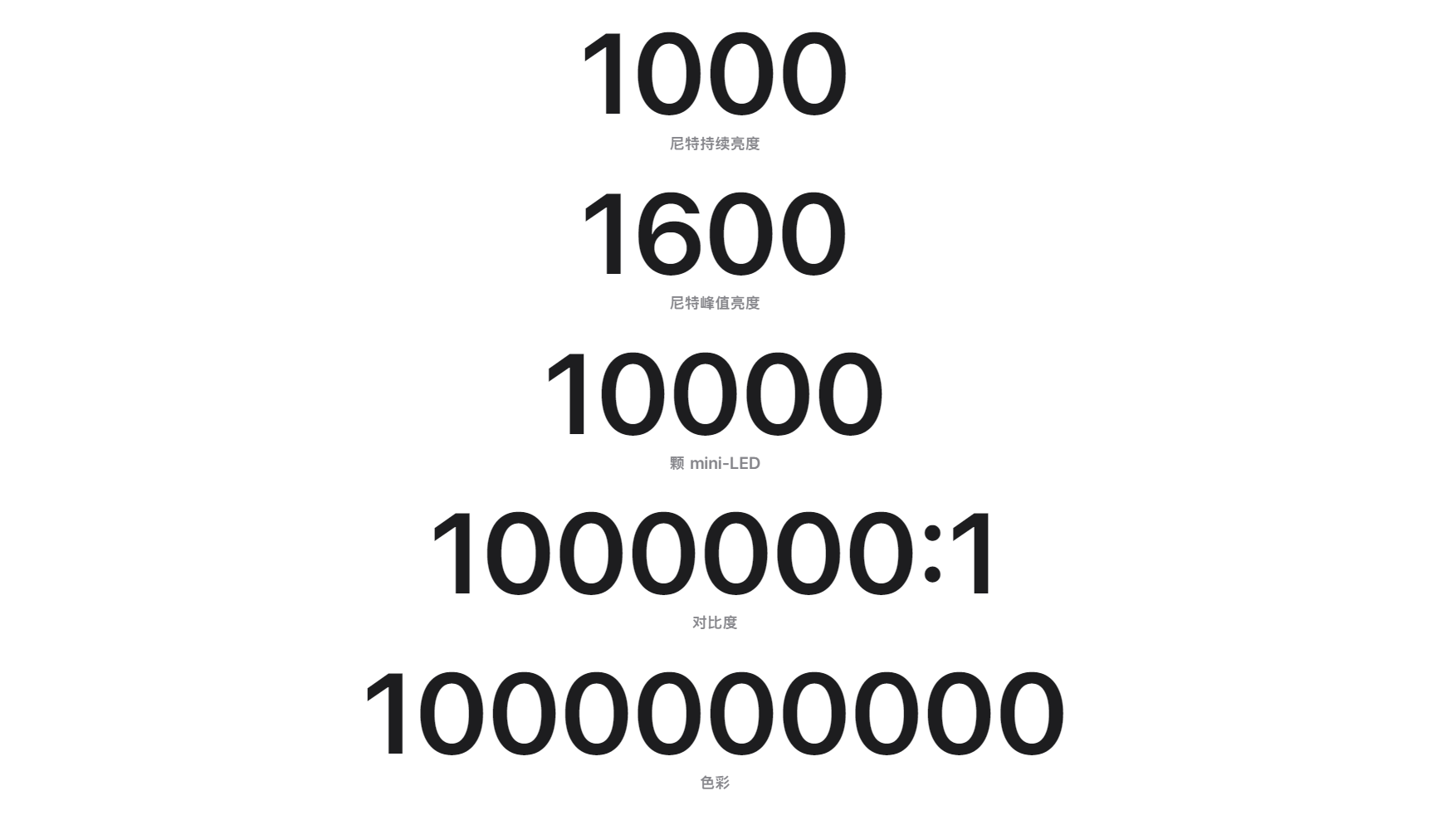 屏幕方面的另一个大更新是,采用了iPad Pro (2021 12.9)同款的miniLED材质屏幕,支持了ProMotion(24Hz-120Hz)(通常所谓“高刷屏”),也就是所谓的Liquid XDR Retina 屏,拥有1000000:1 对比度以及1000nit峰值1600nit亮度(更多优点不再赘述)